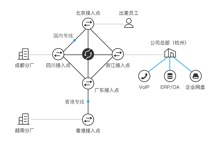 混合形态的骨干联网架构,每根专线都配有备份链路
